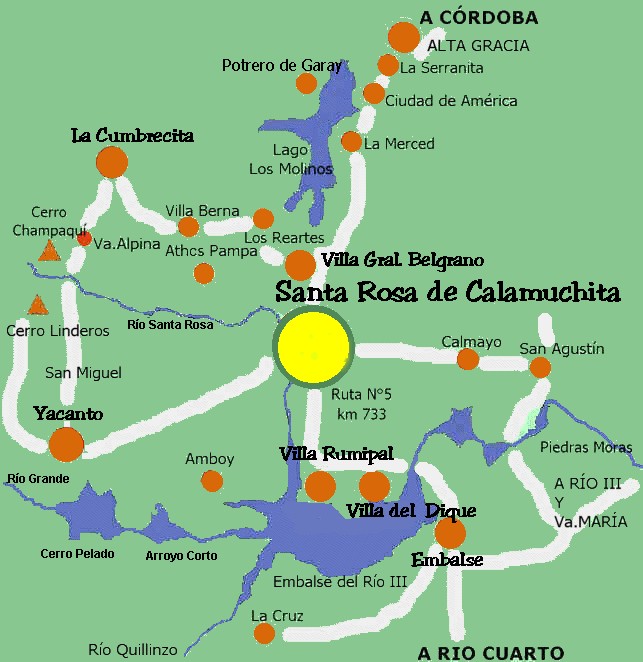 El paseo continúa en Villa del Dique, joven pueblo turístico que nos muestra su agradable urbanización y su hermoso barrio de Embalsina. Rodeando el cerro nos permite una vista panorámica de todo el lago. Ya con dirección norte pasamos por El Torreón llegando unos kilómetros después de Santa Rosa de Calamuchita.